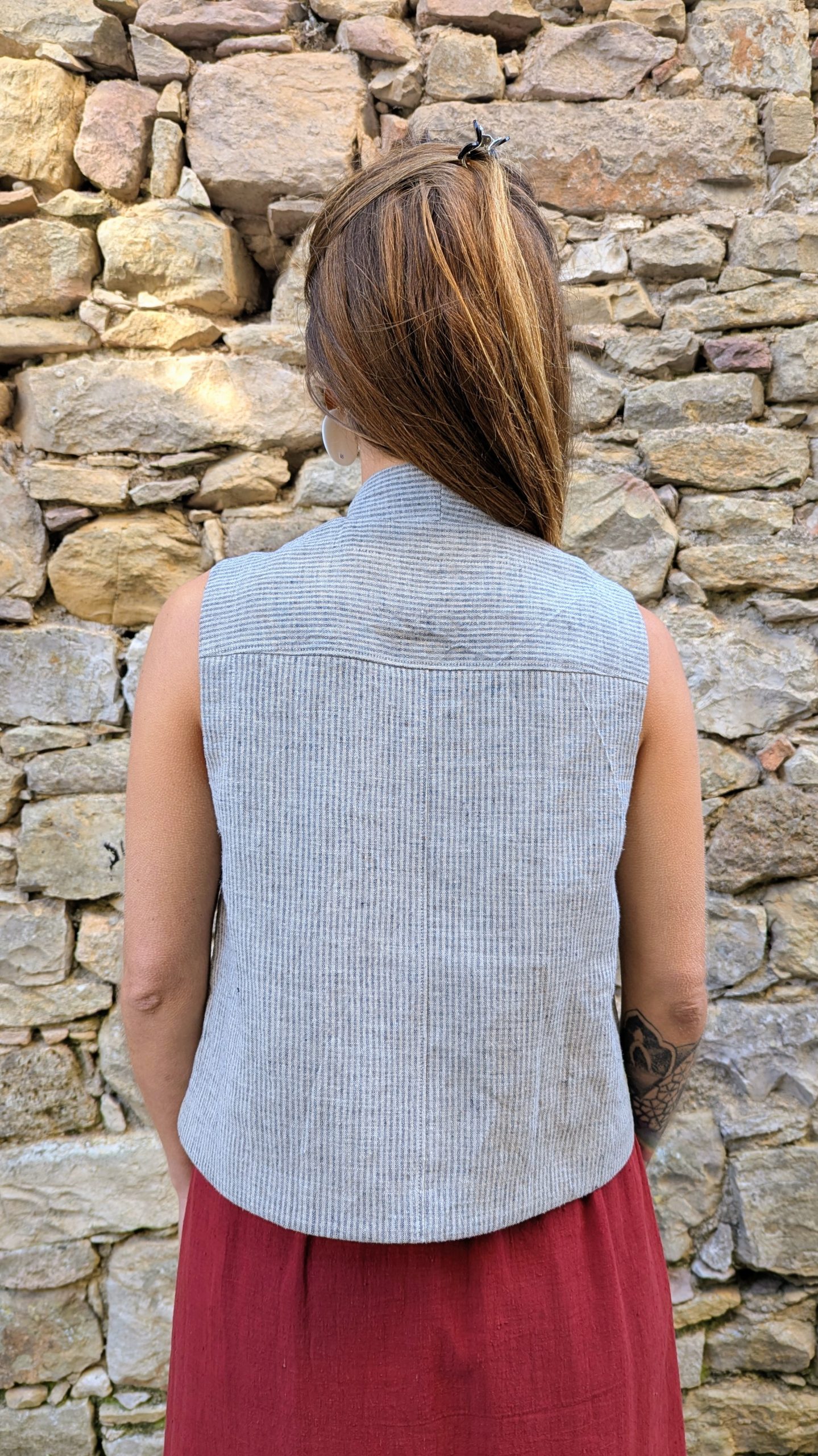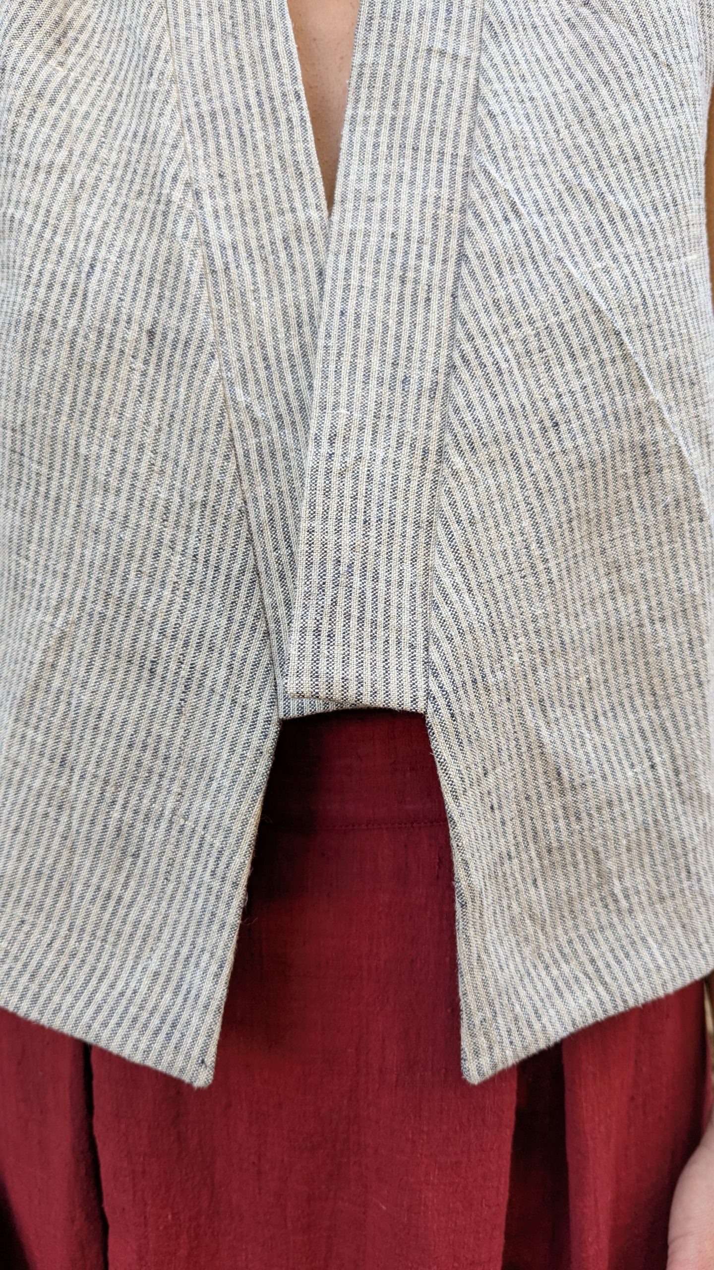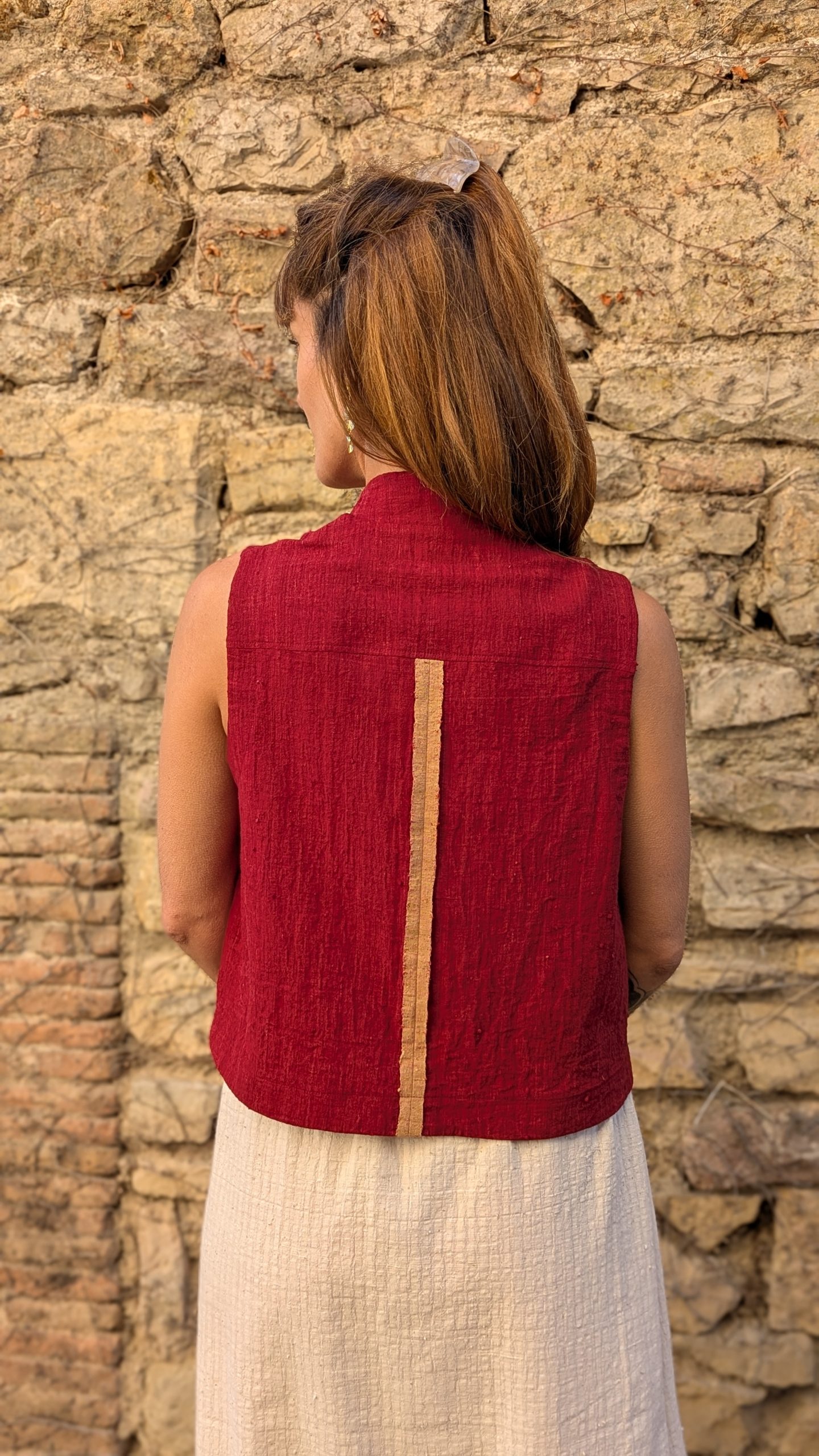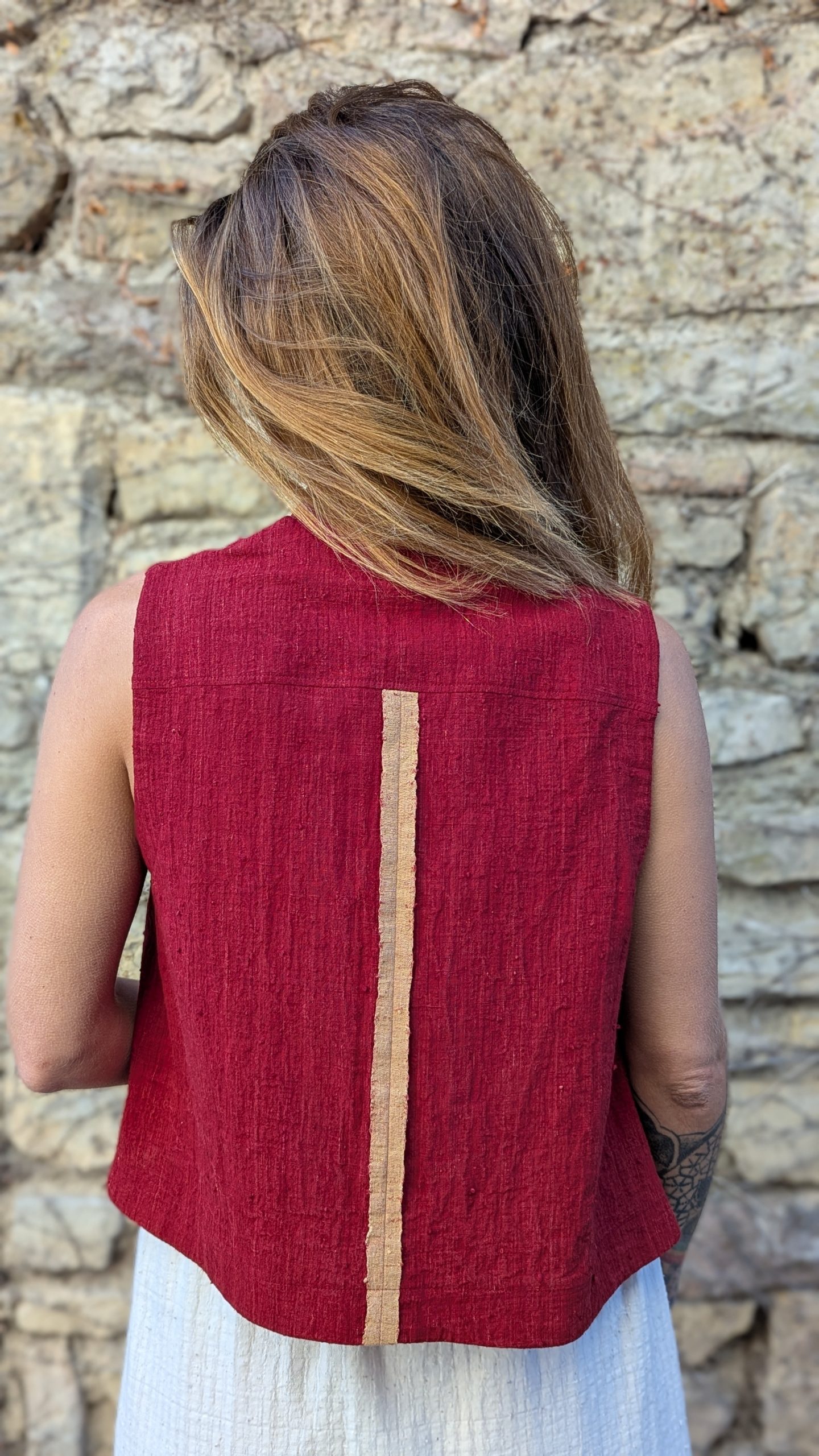 Finished with a visible selvedge at the center back and topstitched detailing all around. The fabric holds a rustic charm and adds texture and depth in a handwoven cloth, that balances craftsmanship without heaviness.