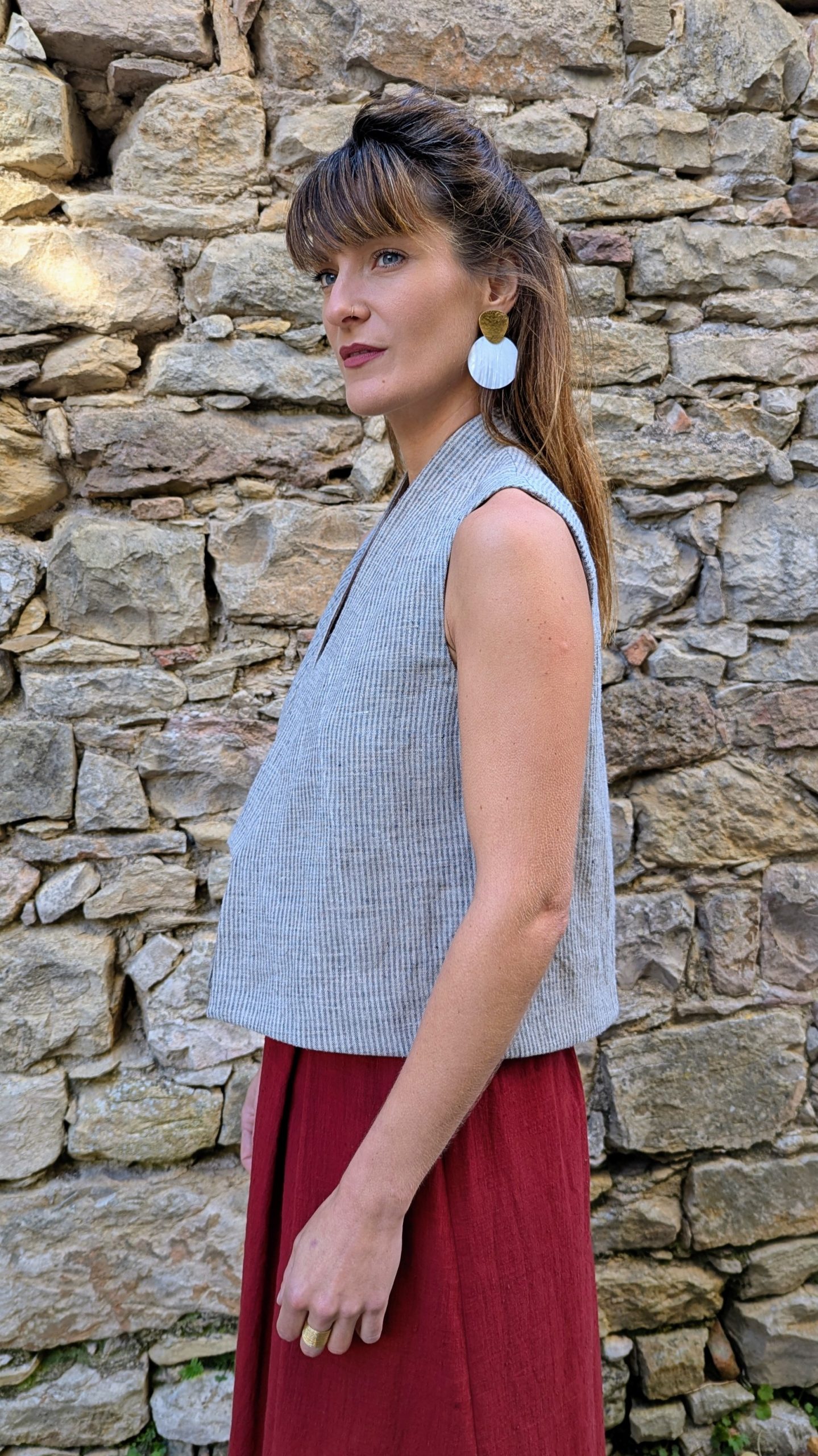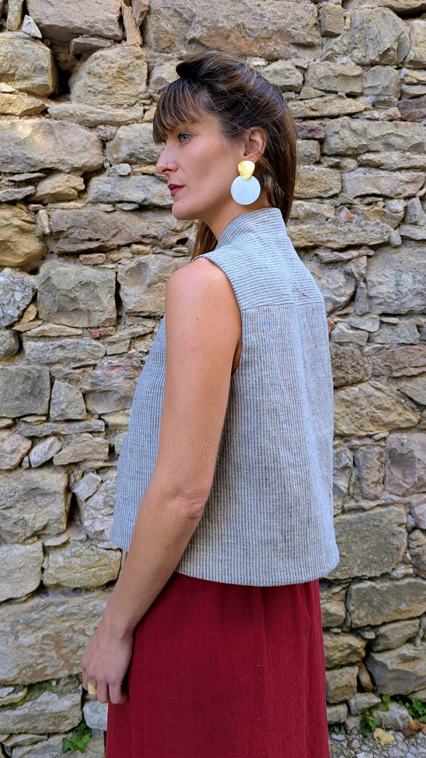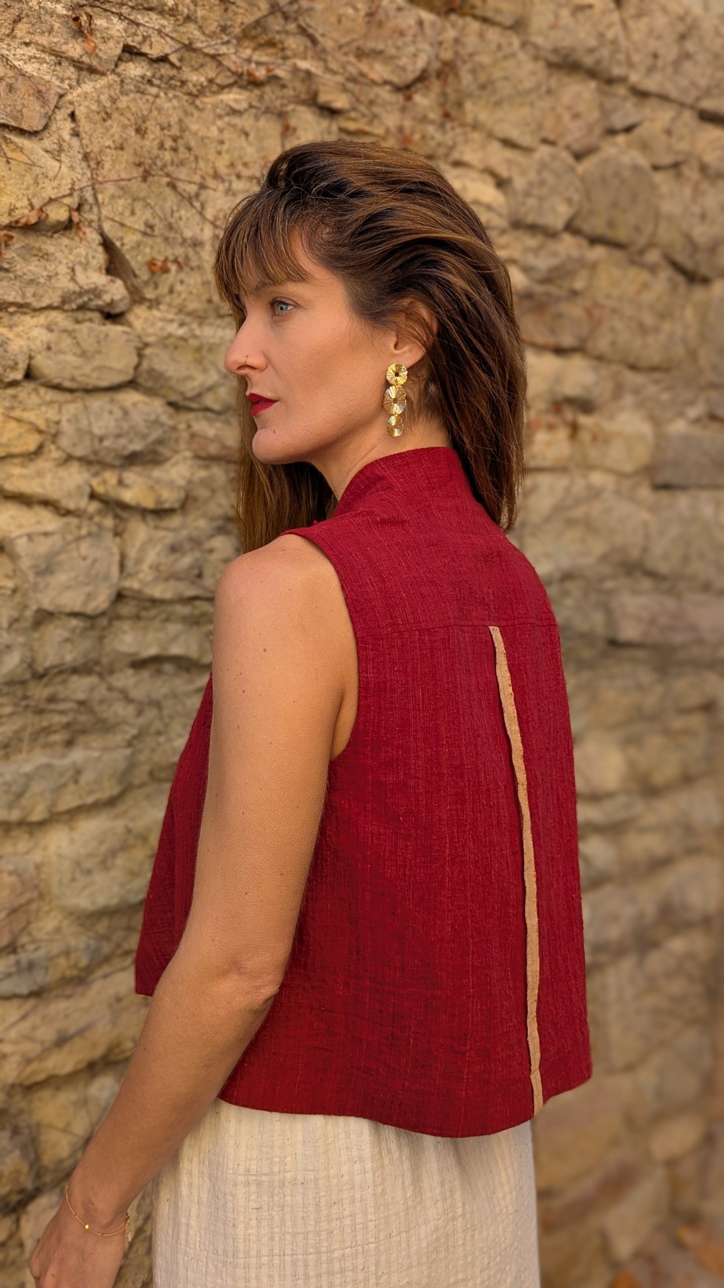 Finished with a visible selvedge at the center back and topstitched detailing all around. The fabric holds a rustic charm and adds texture and depth in a handwoven cloth, that balances craftsmanship without heaviness.