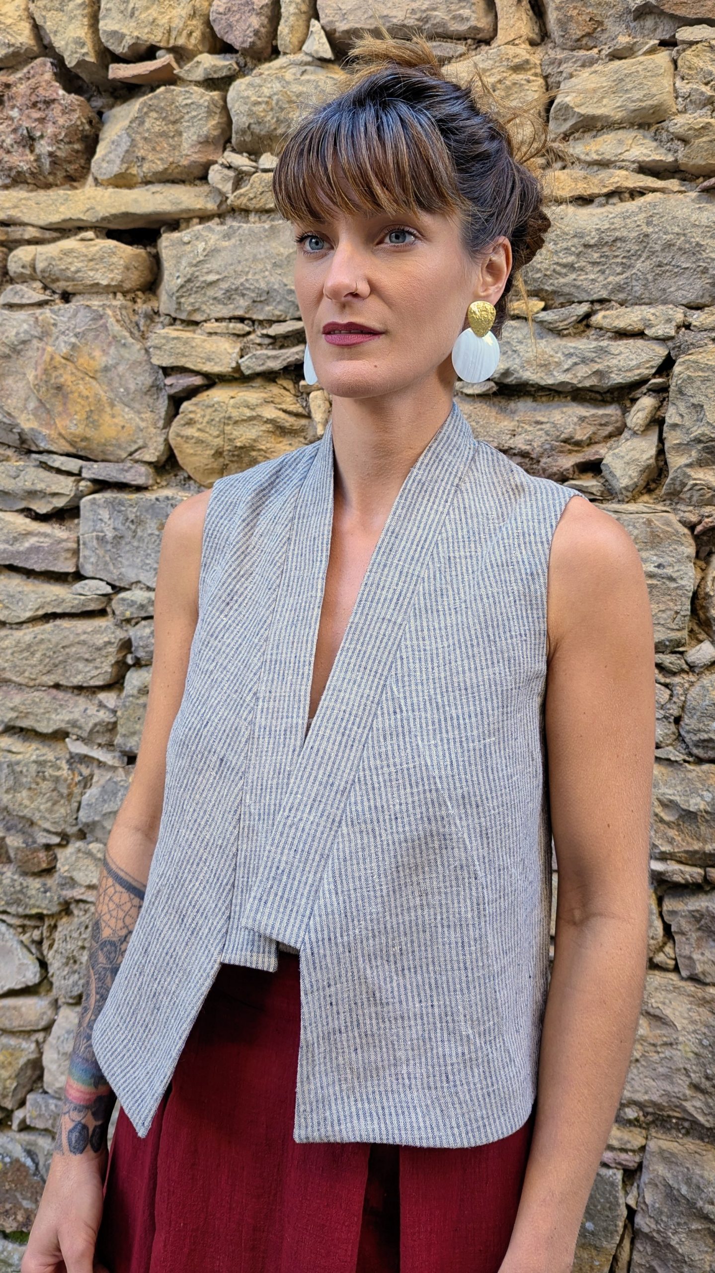 A refined essential with a sculptural edge. The Sleeveless Jacket is crafted with clean lines and layers beautifully over dresses, shirts, blouses or t-shirts. The collar can be worn two ways- left up and relaxed for folded over neatly for a different look.
